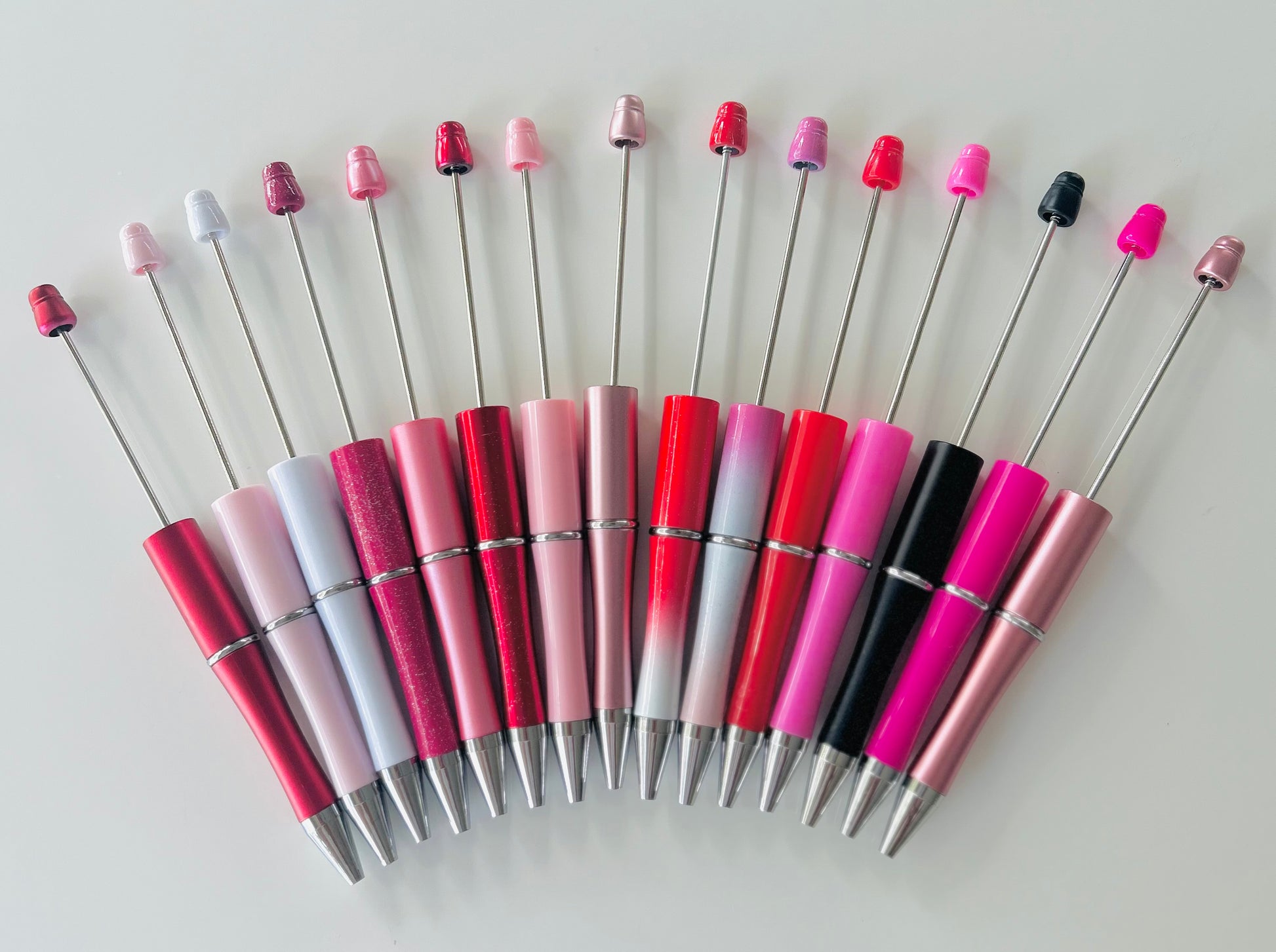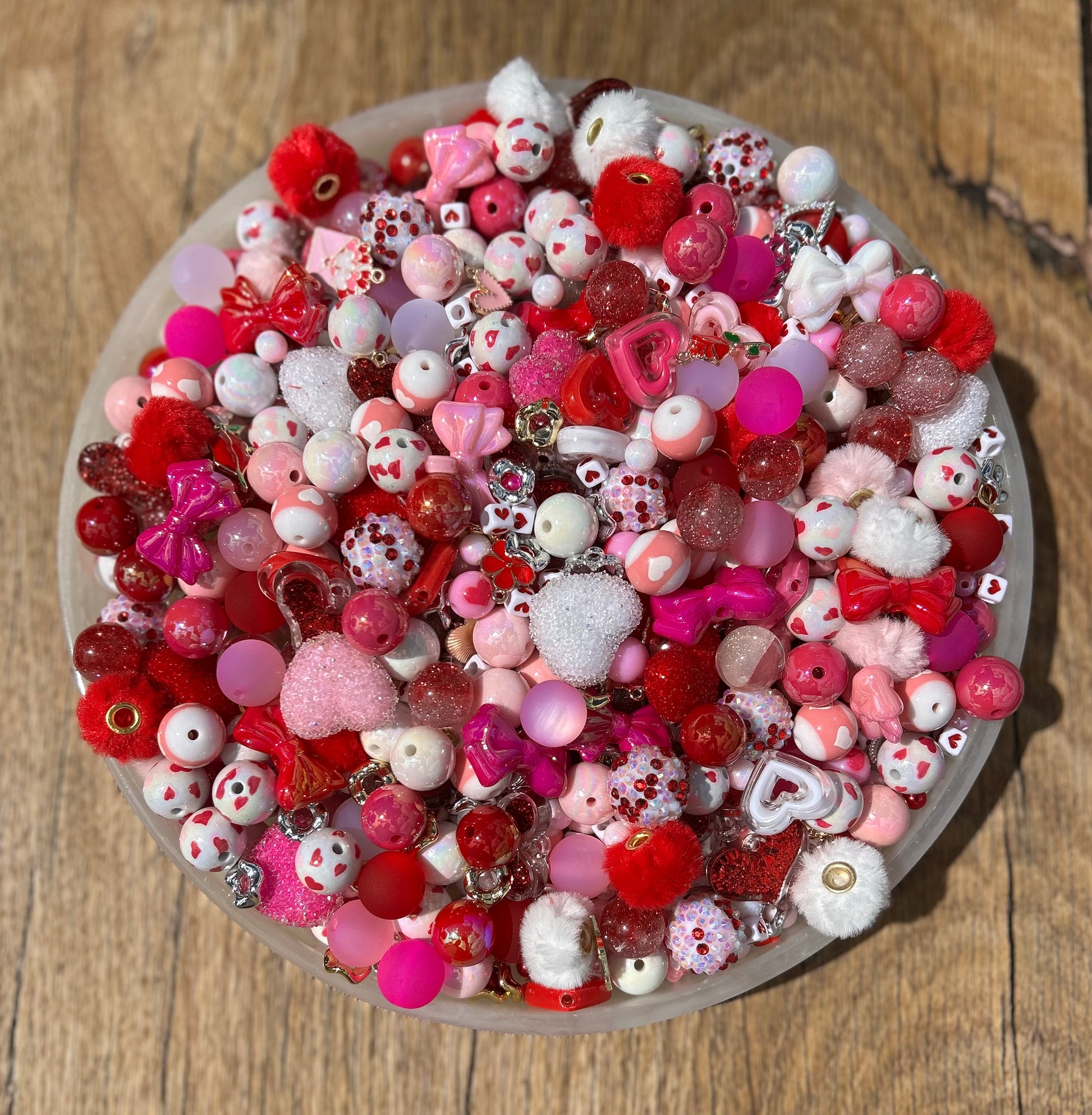 Our valentine's mix is a combination of selected beads in various sizes ranging from 6mm to 20mm, metal charms and fluffy Spacers. Each scoop will come with one plain beadable pen and one beadable heart pompom keychain.